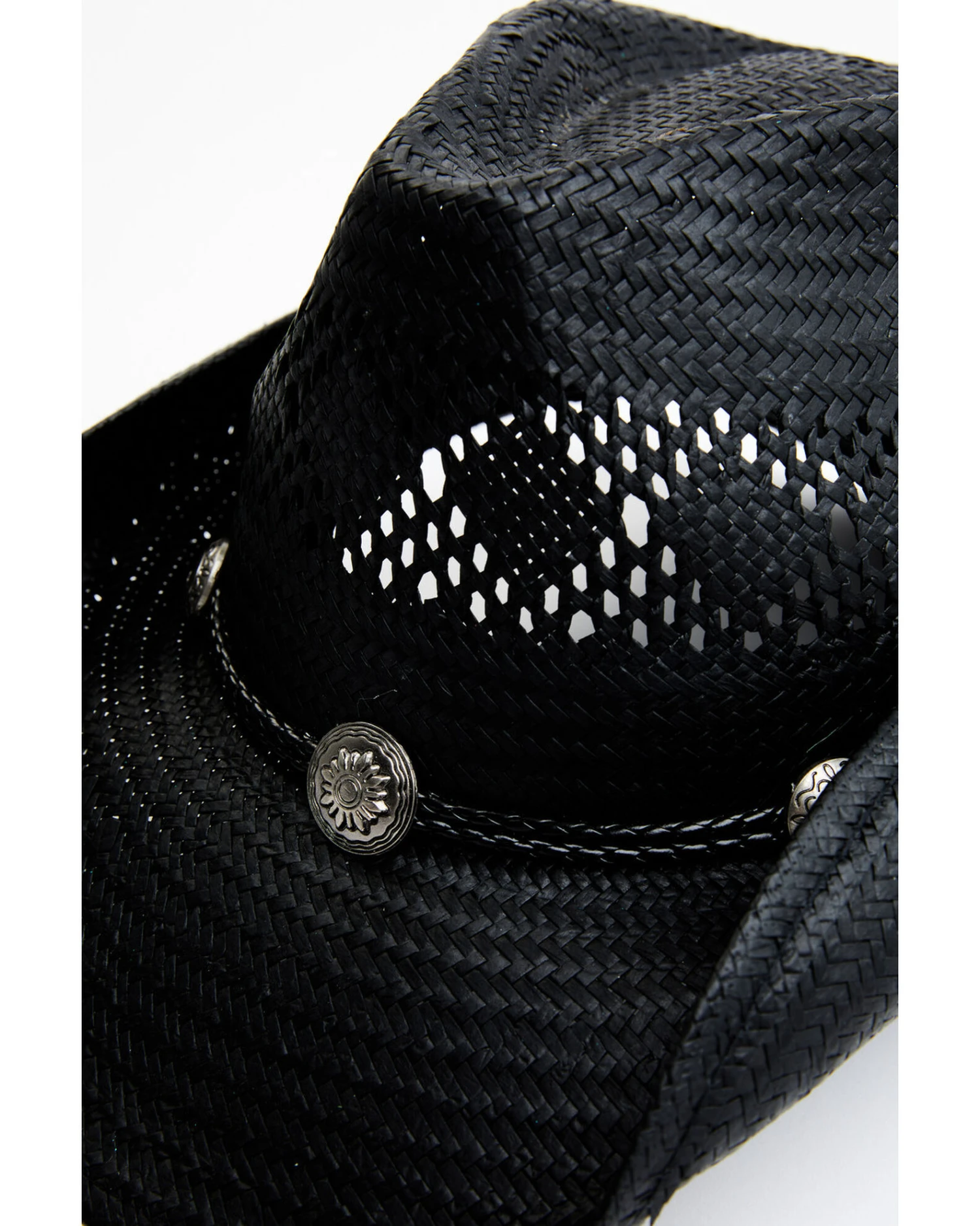 - Braided hat band with silver-tone etched conchos
